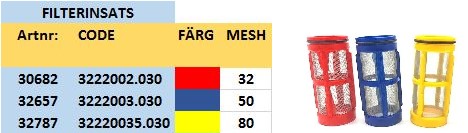 Om filtret inte finns i rätt mesh finns det möjlighet att köpa till filterinsats och byta till önskad mesh 32/50/80 enligt andra tabellen.
