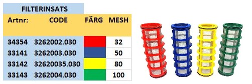 Om filtret inte finns i rätt mesh finns det möjlighet att köpa till filterinsats och byta till önskad mesh 32/50/80/100 enligt andra tabellen.